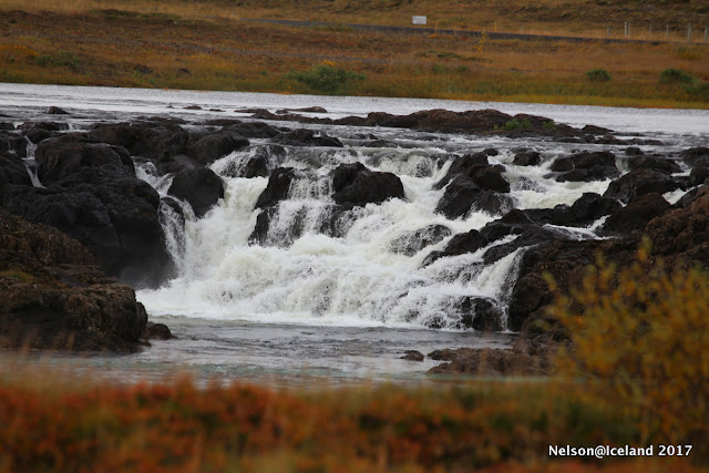 離開Borgarnes 進入斯奈佛半島後,公路量旁盡是黃色的秋景,但遠處卻有一個隱身其中的小瀑布,瀑布不大,我想它是因為火山活動而形成的,它在一片黃色景緻中,更顯凸出,讓秋意更濃更美,讓人一定得駐足欣賞.