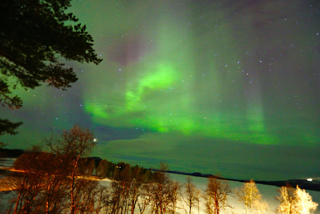 自從在極光漂浮屋享受滿天星斗與夢幻極光之後,天氣一直都不好,直到來到Arjeplog,根據瑞典的氣象報告似乎有轉晴的跡象.但直到下午,天空卻還不時飄著雪.直到傍晚,雲層雖仍滿佈,但已經不若先前陰霾厚重.我們花錢住好房間的好處是走到陽台就可以看看是否有極光.探頭往天空望,雖然是多雲天,但有看到極光,於是我們打算走到飯店後面的湖畔去試試運氣.